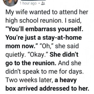 I Dismissed My Wife’s High School Reunion Plans With a Cruel Joke About Her Being “Just” a Stay-at-Home Mom, but When a Heavy Package Arrived Weeks Later Revealing the Hidden Impact of Her Work, the Awards She Never Mentioned, and the Honor She Quietly Gave Up Because of My Words, I Realized I Had Completely Misunderstood the Woman I Married